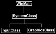 이 프레임워크는 먼저 4가지 구성 요소로 시작된다. 먼저 애플리케이션의 진입점을 다루기 위해 WinMain 함수를 구현할 것이다. SystemClass는 WinMain 함수에서 호출할 전체 애플리케이션을 캡슐화 한 클래스이다. SystemClass 안에는 사용자 입력을 처리할 InputClass와 DirectX 코드를 처리할 GraphicsClass가 포함될 것이다. 다이어그램은 다음과 같다.