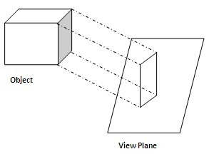 parallel 혹은 orthographic (직교 투영) : 나와 멀어지는 축 하나를 완전히 무시하고 그냥 찌부시킨다. 거리에 따라 물체를 단순히 sorting한다고 보면 되겠다. DOP(direction of projection)이 수직으로 나아간다.