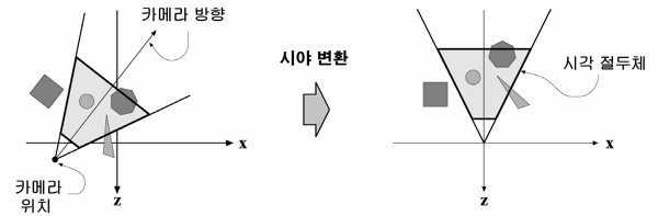 시점이 전역좌표계의 원점에 위치함에 따라 씬이 시점을 기준으로 통째로 이동된다고 보면 된다.